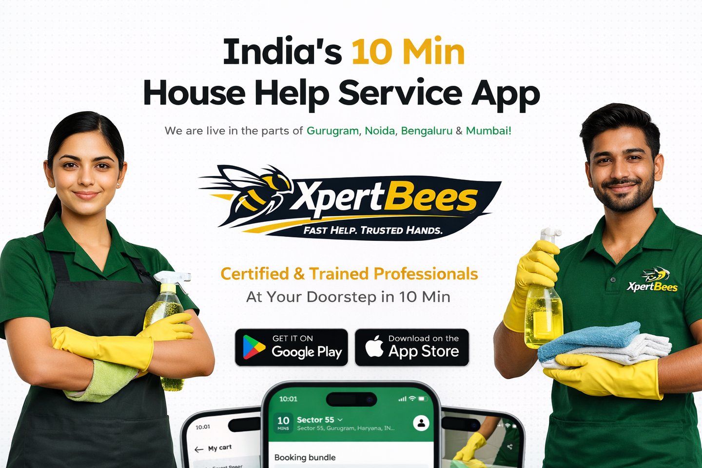 We connect you with verified, trained, and background-checked professionals for cleaning and essential home services—delivered to your doorstep within 10 minutes. Whether it’s urgent cleaning, daily help, or on-demand assistance, XpertBees ensures reliable service exactly when you need it.
